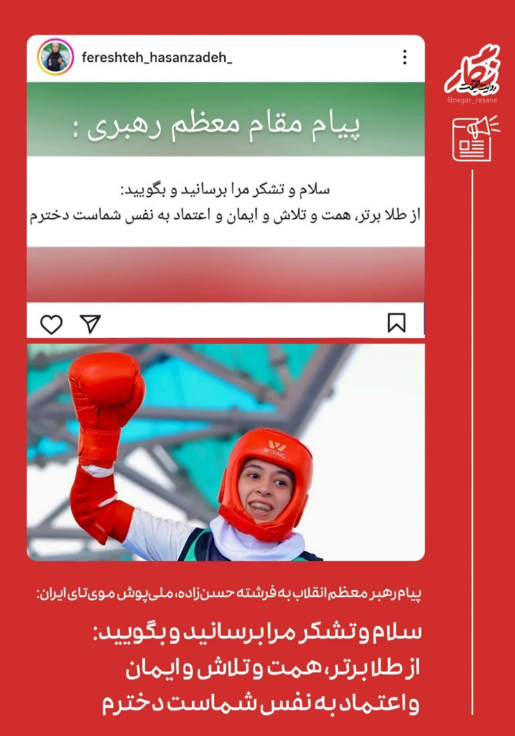حضرت آیتالله خامنهای در پیامی به این بانوی ورزشکار نوشتند: سلام و تشکر مرا برسانید و بگویید: از طلا برتر، همت و تلاش و ایمان و اعتماد بهنفس شماست دخترم.