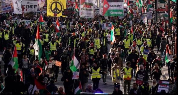تظاهرات ملی در انگلیس با حضور صدها هزار معترض از طیف های وسیع و مختلفی از جامعه برای پایان دادن به بمباران و محاصره غزه توسط اسرائیل از ۷ اکتبر تا کنون تقریبا هر هفته برگزار می شود.